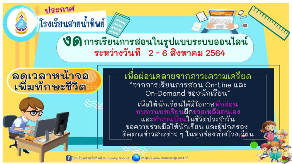 โรงเรียนสายน้ำทิพย์ งดการจัดการเรียนการสอนในรูปแบบระบบออนไลน์ เพื่อให้นักเรียนได้ทบทวนความรู้และทำใบงานที่ยังไม่เรียบร้อย อีกทั้ง เพื่อให้นักเรียนได้ผ่อนคลายจากความเครียดที่ต้องใช้สายตากับอุปกรณ์การเรียนออนไลน์ ระหว่างวันที่ 2 -6 สิงหาคม 2564 และจะมีการเรียนการสอนออนไลน์ตามปกติ ในวันจันทร์ที่ 9 สิงหาคม 2564 เป็นต้นไป